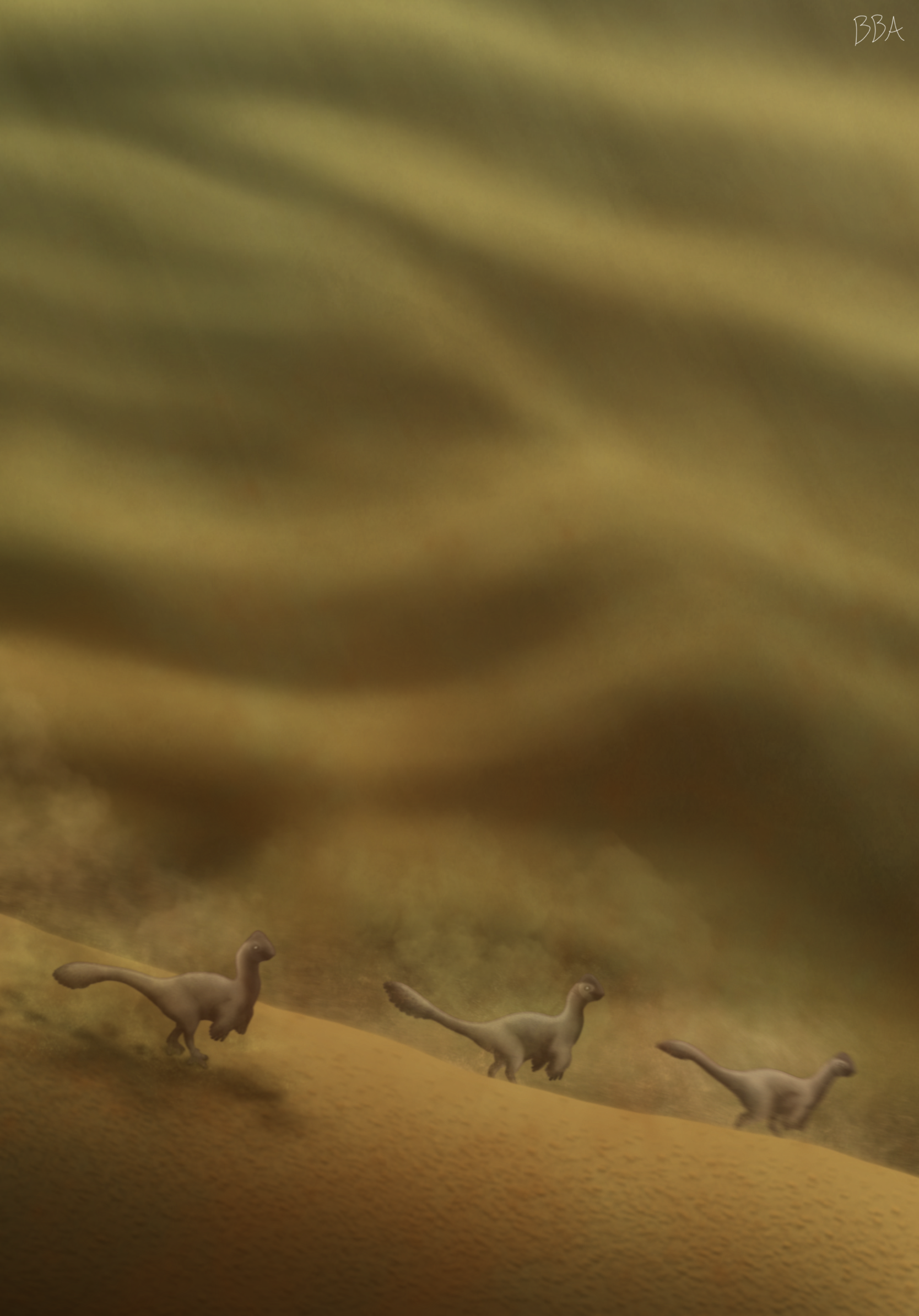 A trio of oviraptors make their way down from a massive sand dune. All three of them are male and are in search for a mate.